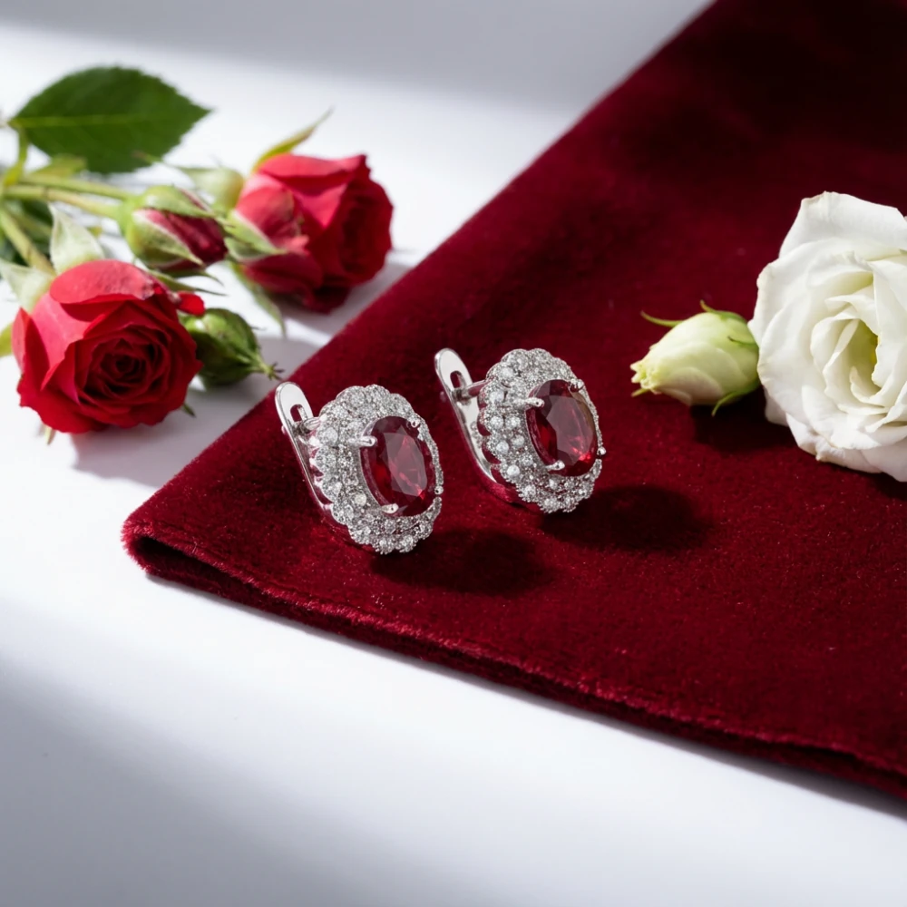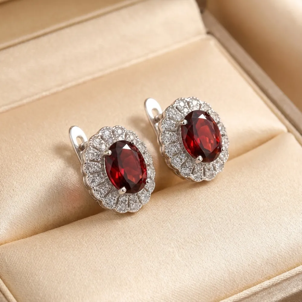 The Garnet Royal Bloom Halo Earrings showcase a striking combination of deep red natural garnets embraced by an intricately crafted floral-inspired halo of sparkling Cubic Zerconia. The rich crimson hue of the garnets radiates warmth and depth, while the surrounding topaz stones enhance the brilliance, giving the earrings a luxurious, regal appearance.