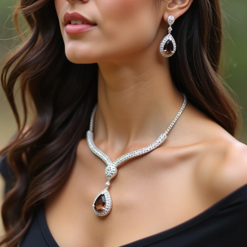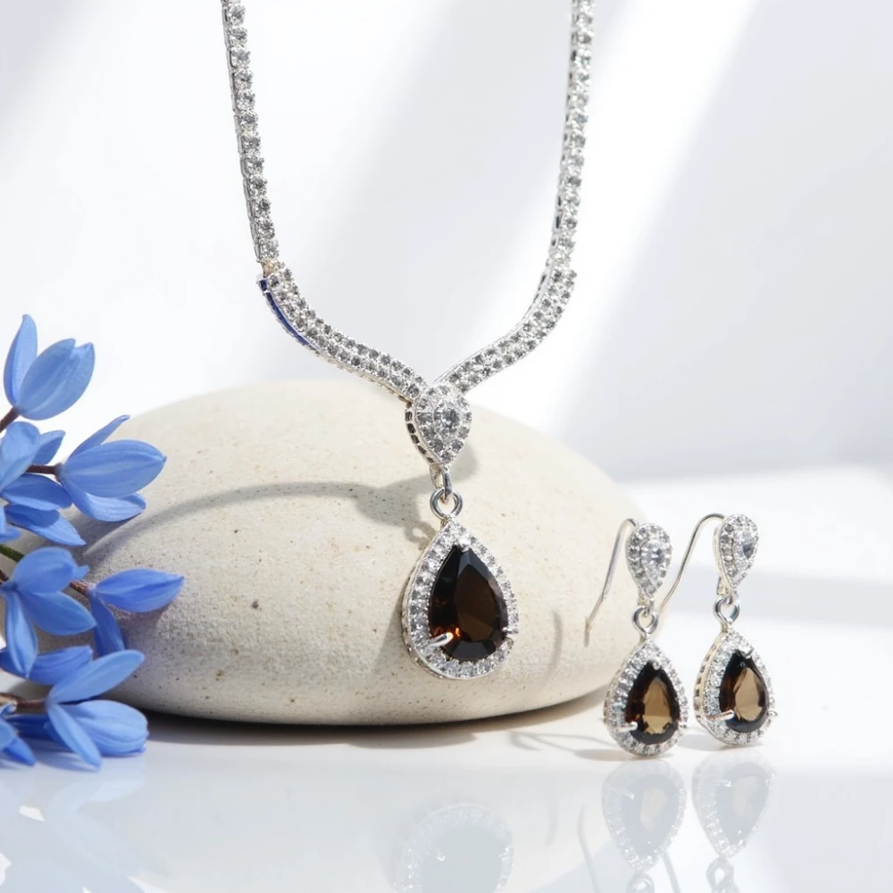 The rich tones of smoky quartz symbolize grounding, confidence, and quiet strength, while the graceful teardrop silhouette enhances the neckline with understated luxury. Designed for formal gatherings and elegant evenings, this set offers a poised statement that feels both powerful and graceful.