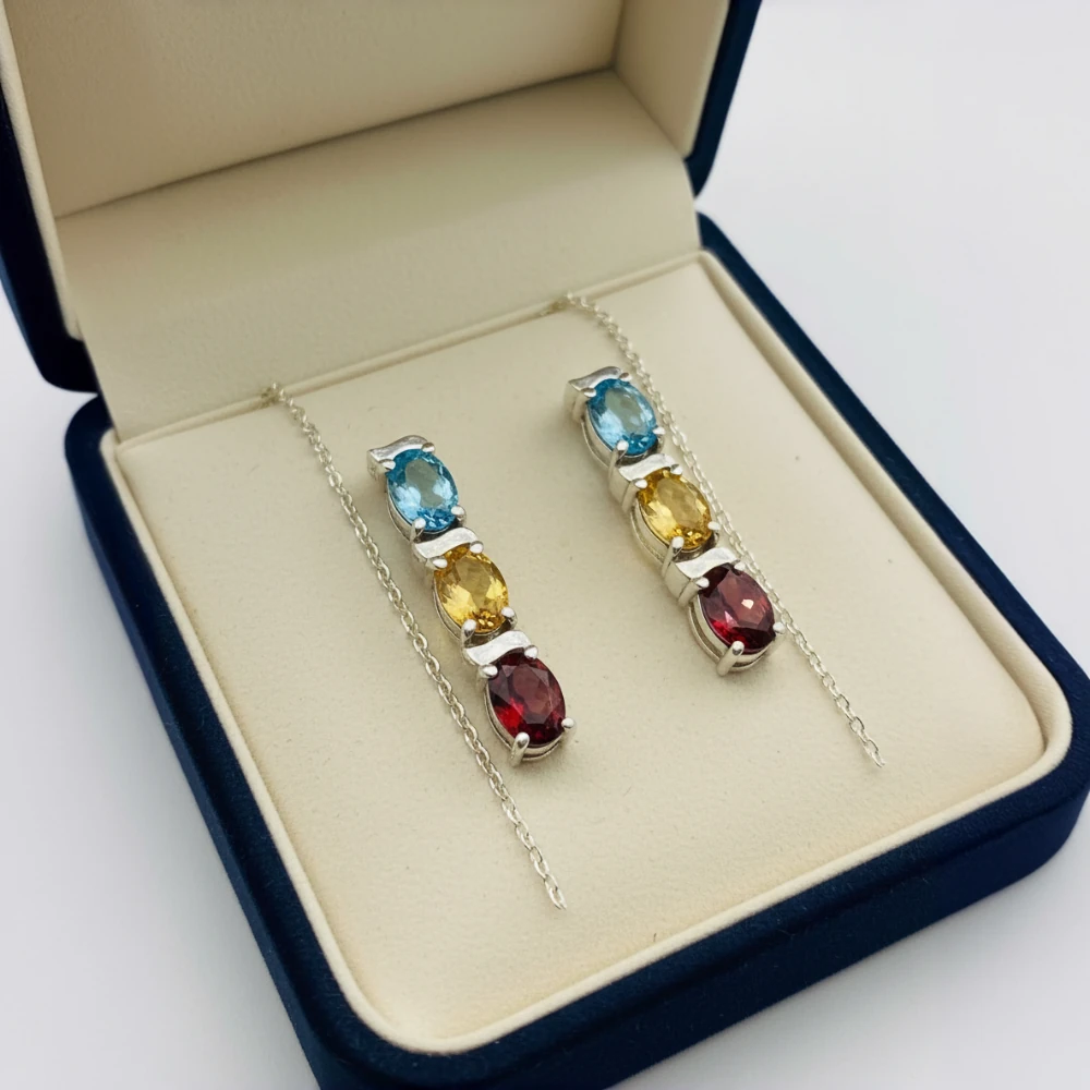 Set in 925 sterling silver, these earrings are crafted with secure prong settings that emphasise each gemstone’s natural beauty. The sleek drop design adds length and elegance, making these earrings ideal for both day wear and evening sophistication. Their harmonious colour trio offers a modern yet timeless aesthetic suitable for any jewellery enthusiast.