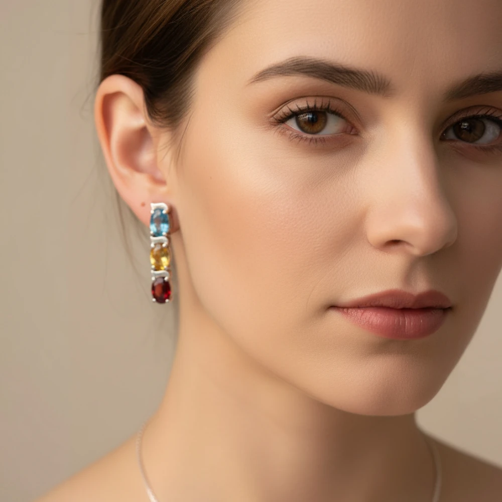 The Tri-Gem Radiance Drop Earrings showcase a graceful vertical arrangement of three vibrant natural gemstones — shimmering Blue Topaz, warm Citrine, and deep Garnet — creating a captivating gradient of colour and brilliance. Each stone is expertly faceted to catch the light beautifully, offering a refined sparkle with every movement.