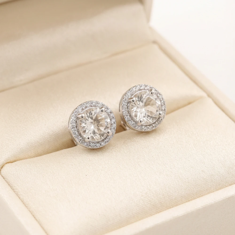 Expertly crafted in 925 sterling silver, these studs feature secure prong settings that allow maximum light to enter the stones, amplifying their natural sparkle. Their classic halo silhouette makes them an effortlessly versatile accessory—ideal for formal occasions, workplace elegance, or adding a refined touch to everyday outfits.