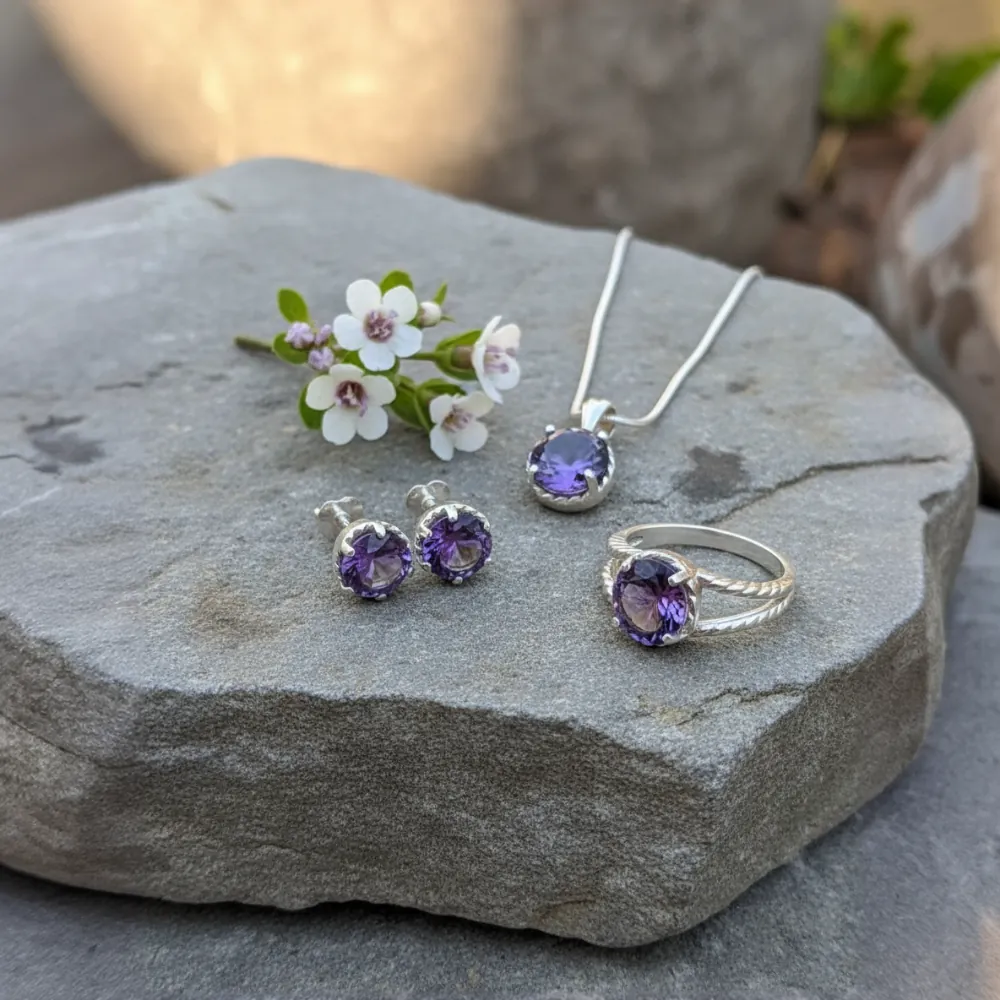 The Amethyst Radiance Trio Set is a timeless classic, featuring natural round-cut amethyst gemstones elegantly set in sterling silver. Comprising a matching pendant, stud earrings, and ring, this refined trio offers a harmonious balance of colour, simplicity, and everyday elegance.
