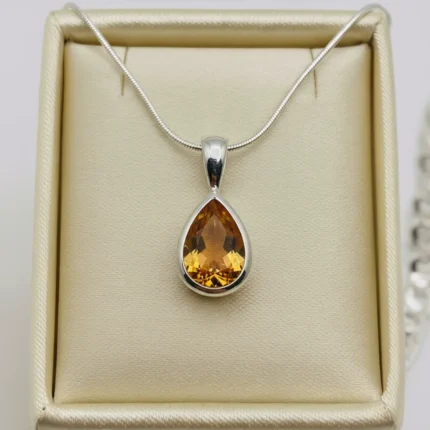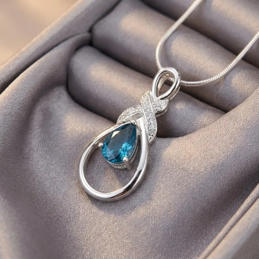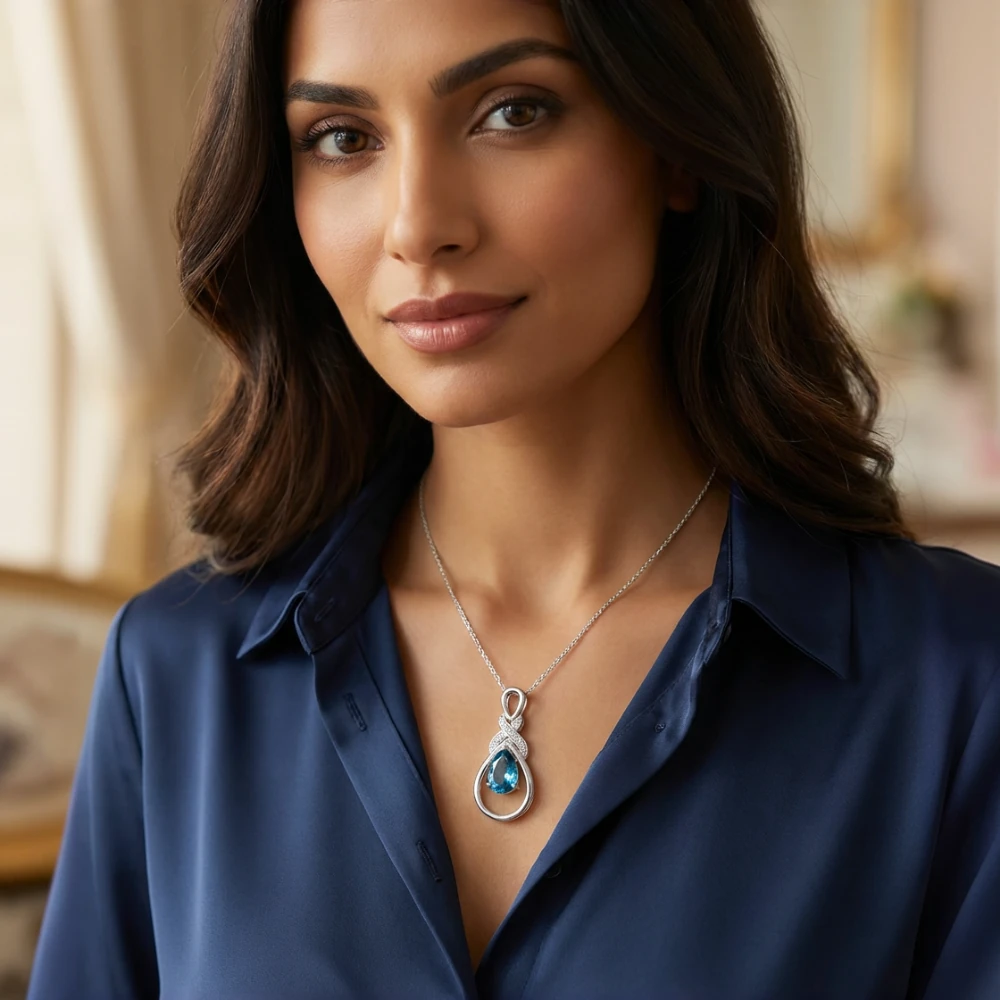The Azure Elegance Pendant expresses refined sophistication through the tranquil brilliance of natural London Blue Topaz. A pear-cut gemstone is gracefully suspended within an artistic open teardrop frame, highlighted by a subtle crossover motif accented with shimmering white topaz. The result is a contemporary design that feels fluid, elegant, and timeless.