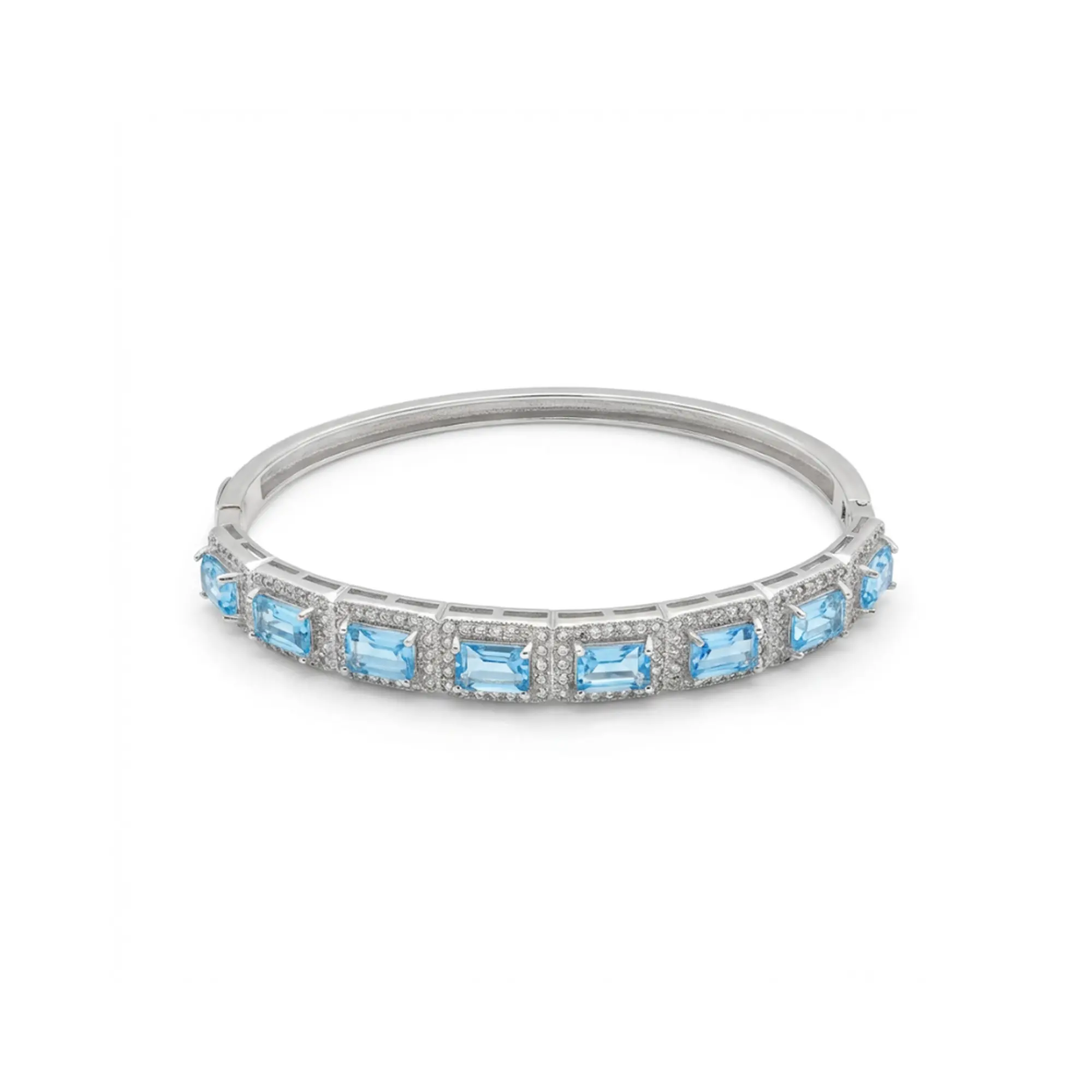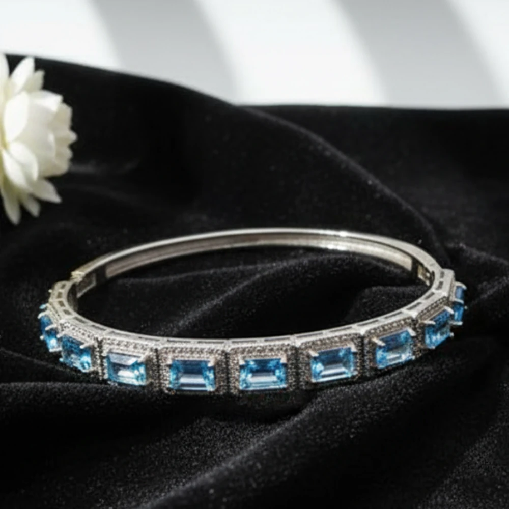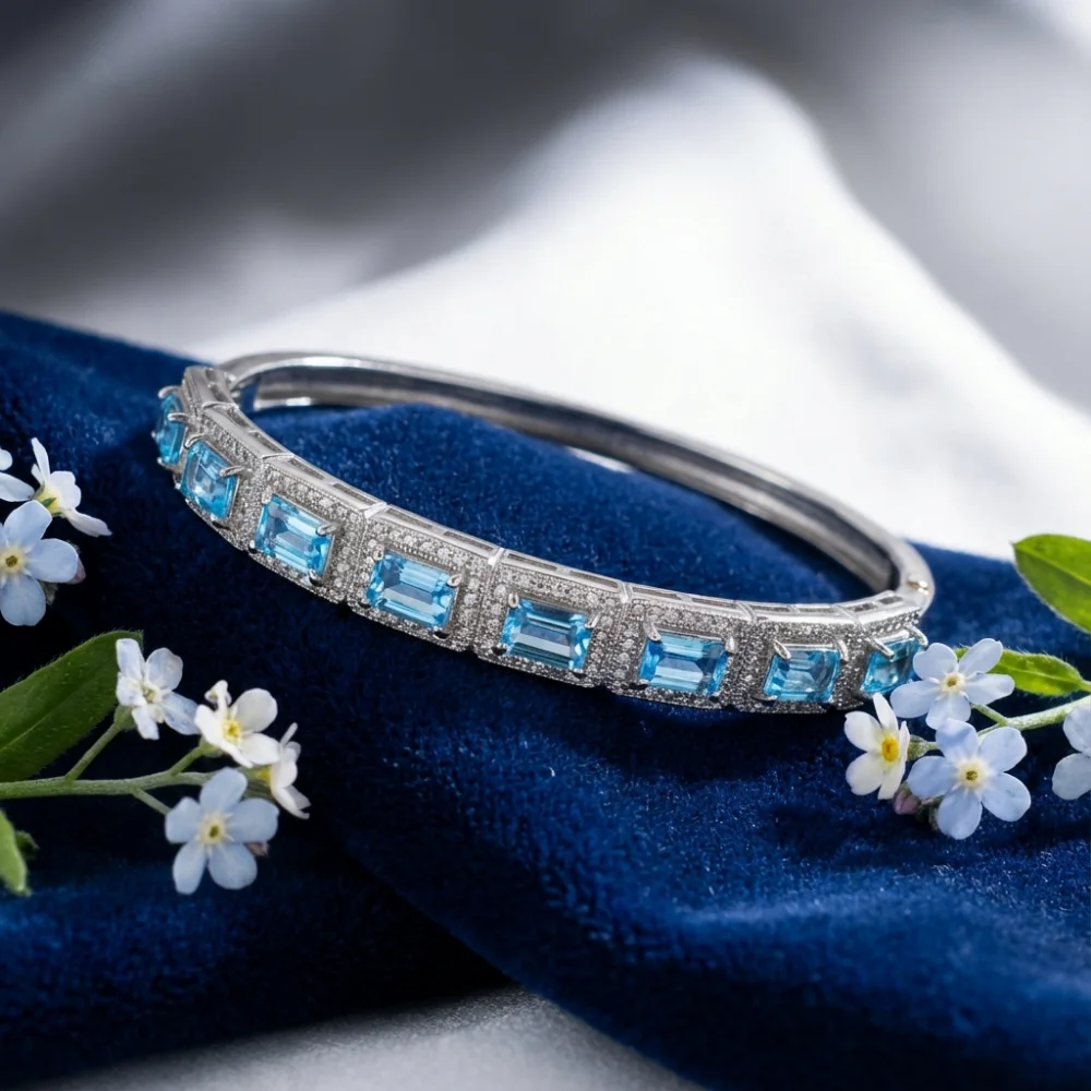 The Azure Luxe Hinged Bangle features radiant emerald-cut Sky Blue Topaz gemstones arranged in a refined linear halo design, offering crisp brilliance and elegant symmetry. Crafted in rhodium-polished 925 sterling silver, this hinged bangle blends architectural beauty with everyday comfort and secure wear.