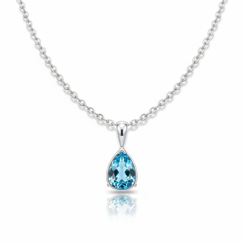 The Blue Topaz Glow Teardrop Pendant reflects serenity and refined elegance through the luminous beauty of natural blue topaz. Featuring a beautifully faceted pear-cut gemstone, this pendant radiates refreshing sky-blue tones that symbolise clarity, calmness, and peaceful energy.