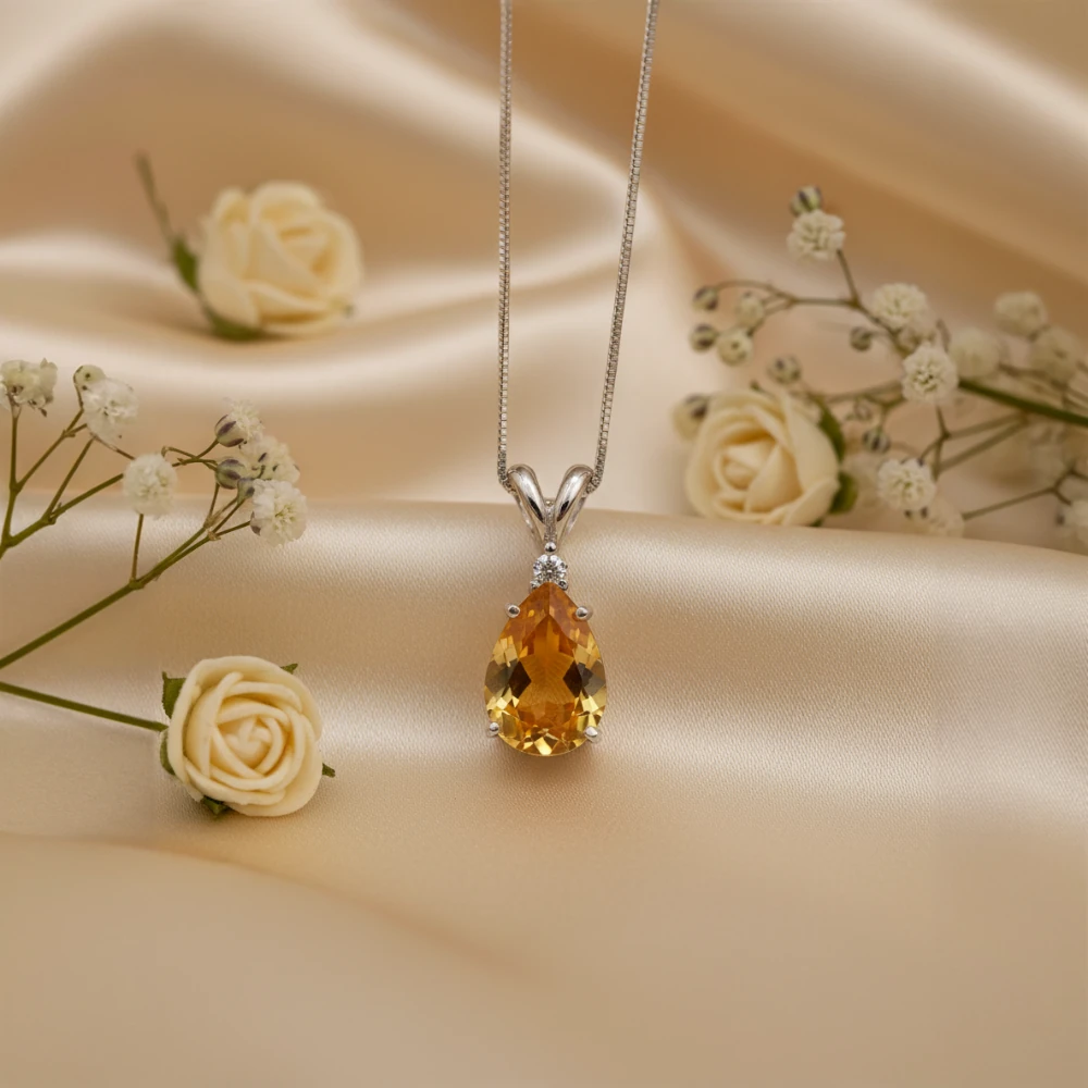 The Citrine Classic Teardrop Pendant radiates warmth and uplifting elegance through its vibrant golden glow. A beautifully faceted pear-cut natural citrine forms the centrepiece, reflecting rich sunshine-yellow tones that symbolise joy, clarity, and positive energy.