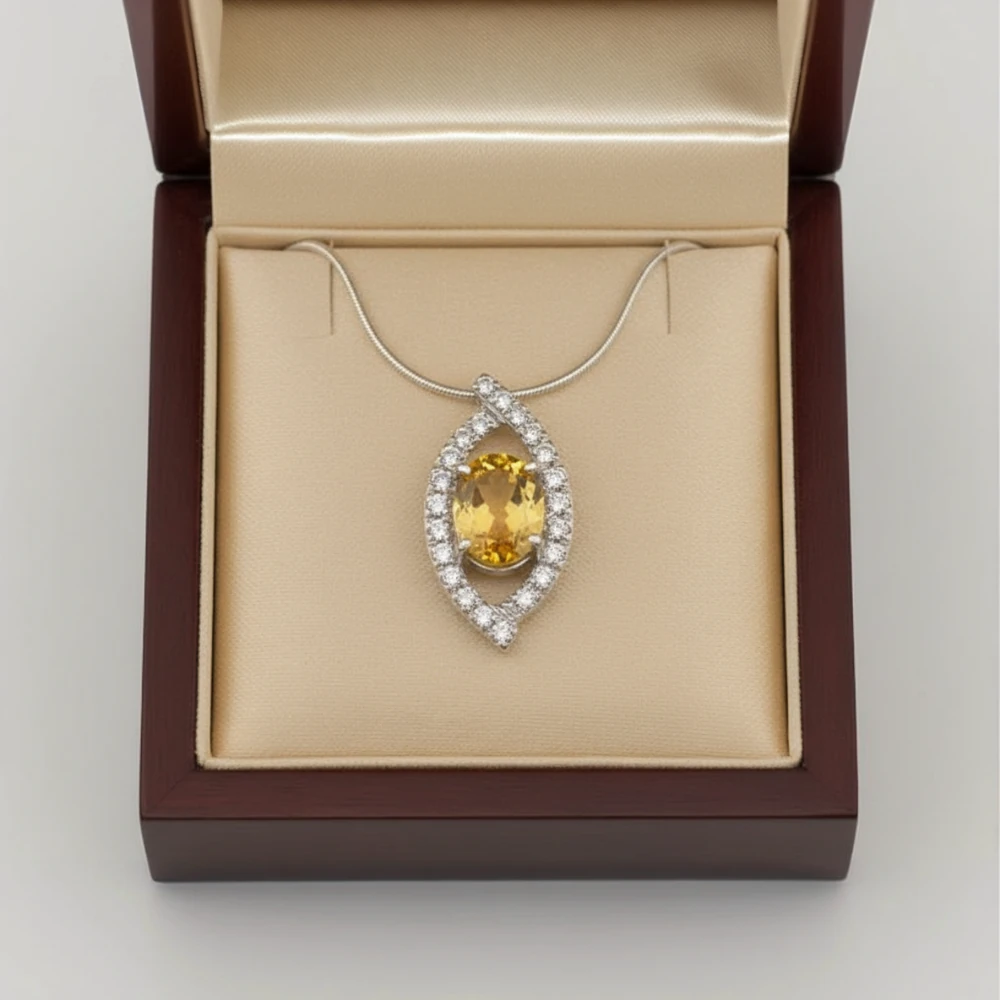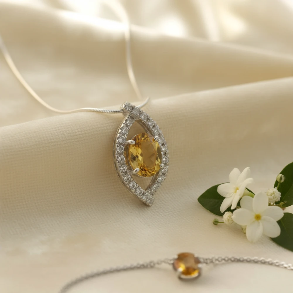 The Citrine Radiant Loop Pendant brings a contemporary touch to classic gemstone elegance. At its heart sits a luminous oval-cut natural citrine, glowing with warm golden-yellow tones that symbolise joy, vitality, and positive energy. The gemstone is gracefully embraced by a curved loop adorned with sparkling natural white topaz, creating depth, movement, and refined brilliance.