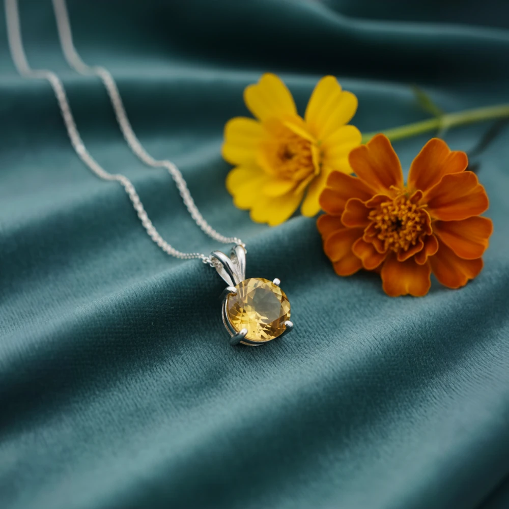 The Citrine Sunbeam Pendant radiates warmth and positivity through the luminous glow of natural citrine. Featuring a beautifully faceted round-cut citrine, this elegant solitaire design captures golden sunlight with every movement, symbolising joy, energy, and optimism.