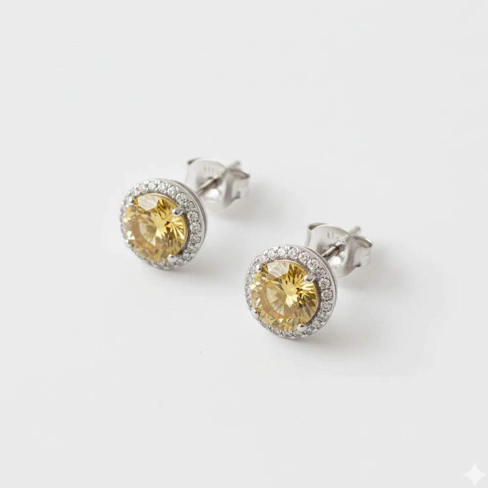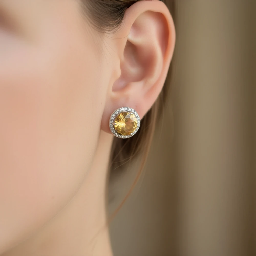 The Citrine Sunlight Halo Ear Studs glow with warm, golden radiance. Each ear stud features a beautifully faceted round natural citrine at the centre, capturing light with a bright sunlit sparkle. Surrounding the gemstone is a delicate halo of Cubic Zirconia, adding refined brilliance and a luxurious finish to the design.
