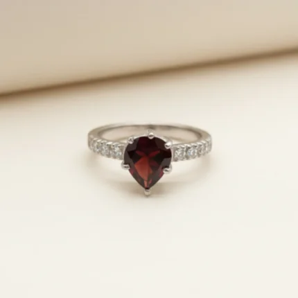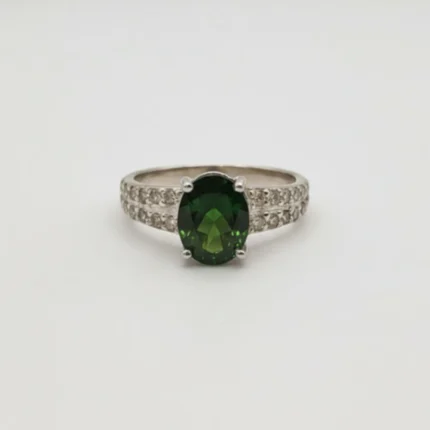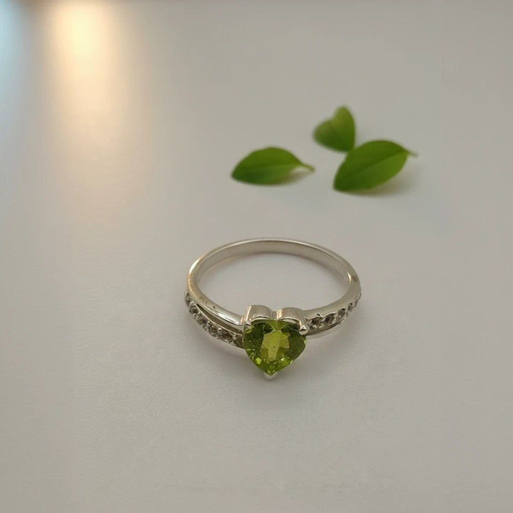 The Eternal Heart Ring – Peridot symbolizes renewal, growth, and fresh beginnings. At its heart lies a beautifully faceted heart-shaped natural peridot, glowing in vibrant green tones that reflect positivity and warmth. Delicate white topaz accents along the side band add a refined sparkle, enhancing the ring’s romantic charm.