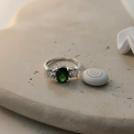 A perfect everyday ring—pair with light neutrals or floral tones to enhance its fresh green glow.