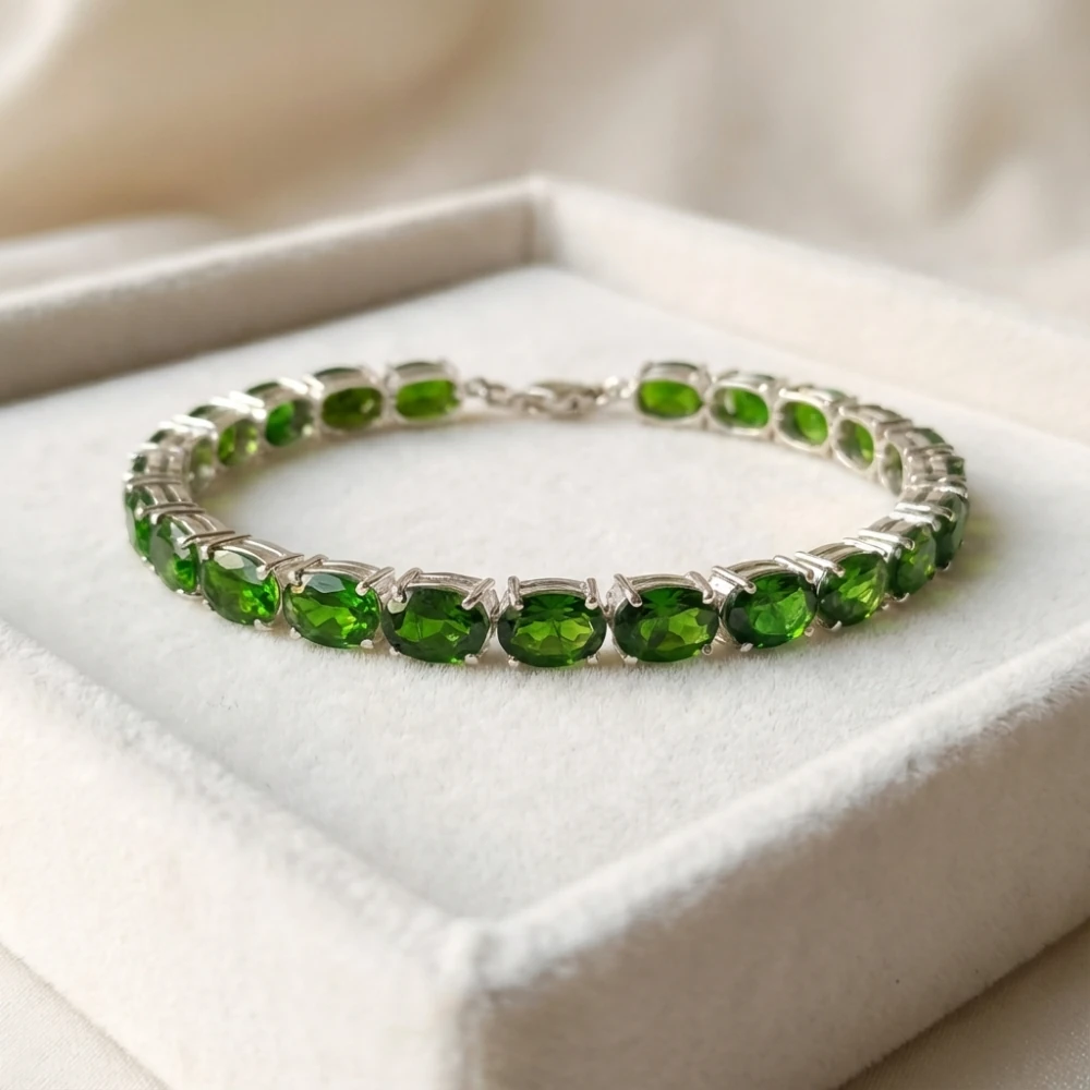 The Forest Elegance Bracelet captures the deep, captivating beauty of nature through vivid oval-cut natural chromium diopside gemstones. Renowned for their intense forest-green brilliance, each gemstone is precision-set in polished 925 sterling silver, creating a refined yet striking silhouette. Elegant, vibrant, and timeless, this bracelet is designed for those who appreciate bold colour balanced with fine craftsmanship.
