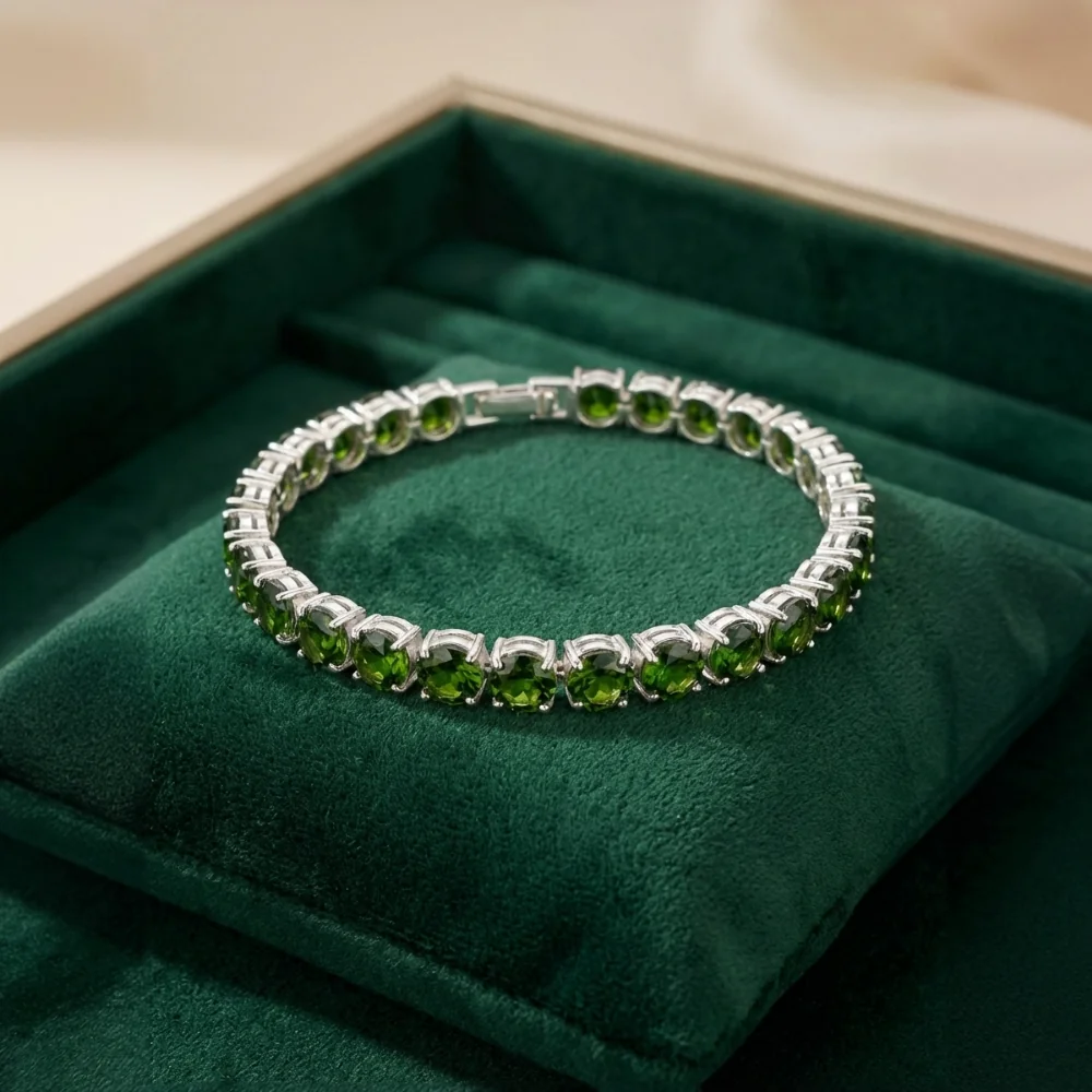 The Forest Luxe Bracelet draws inspiration from the untouched elegance of nature. Featuring a continuous row of natural Chromium Diopside gemstones—celebrated for their deep forest-green brilliance—this refined bracelet radiates depth, luxury, and quiet sophistication.