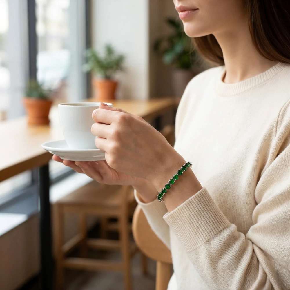 Pair the Forest Luxe Bracelet with neutral, white, or black outfits to let its lush green brilliance stand out—perfect for elegant evenings, formal occasions, or elevating everyday luxury.