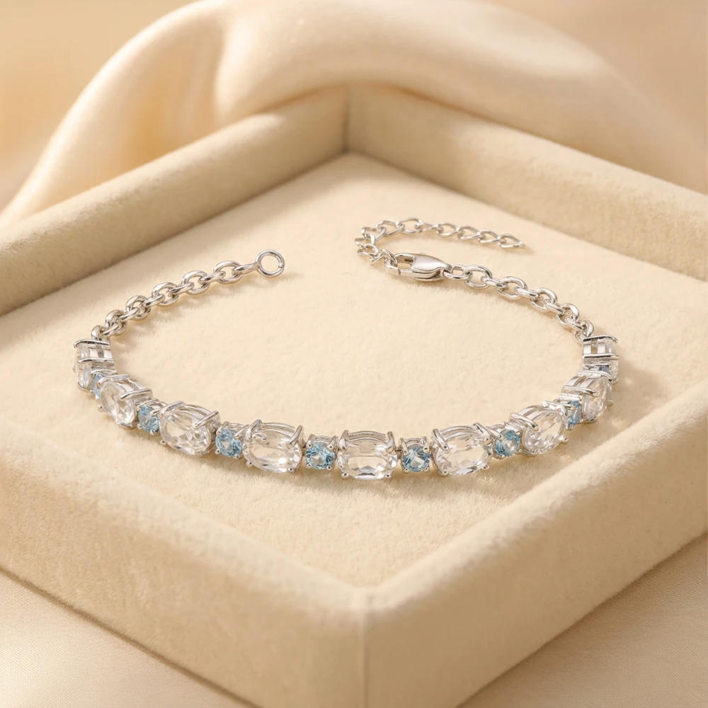 Pair the Glacial Whisper Bracelet with white topaz studs or a sky-blue pendant for a fresh, luminous look that complements both casual and evening outfits.