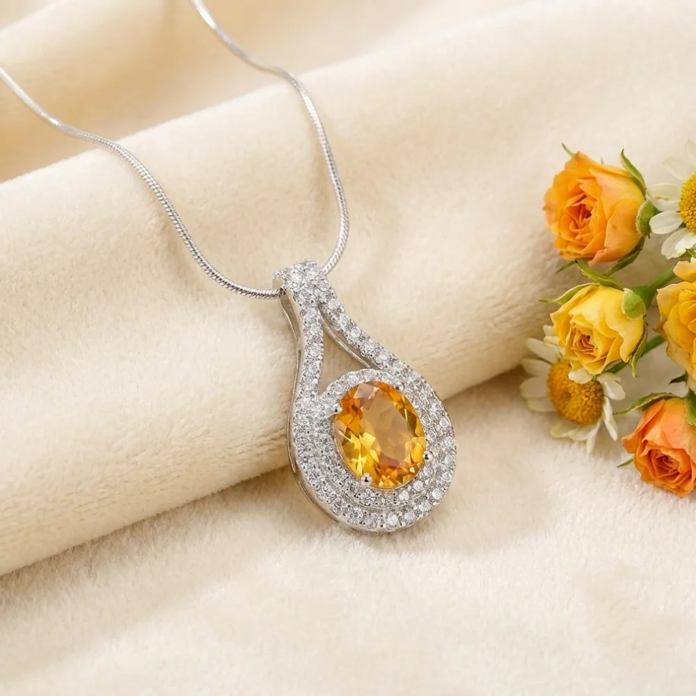 The Golden Aura Pendant – Citrine radiates warmth, optimism, and timeless elegance. At its heart, a luminous oval-cut natural citrine glows with sunshine-like brilliance, symbolising joy, abundance, and positive energy. Encircled by a luxurious double halo of sparkling white topaz, the pendant captures light beautifully from every angle.
