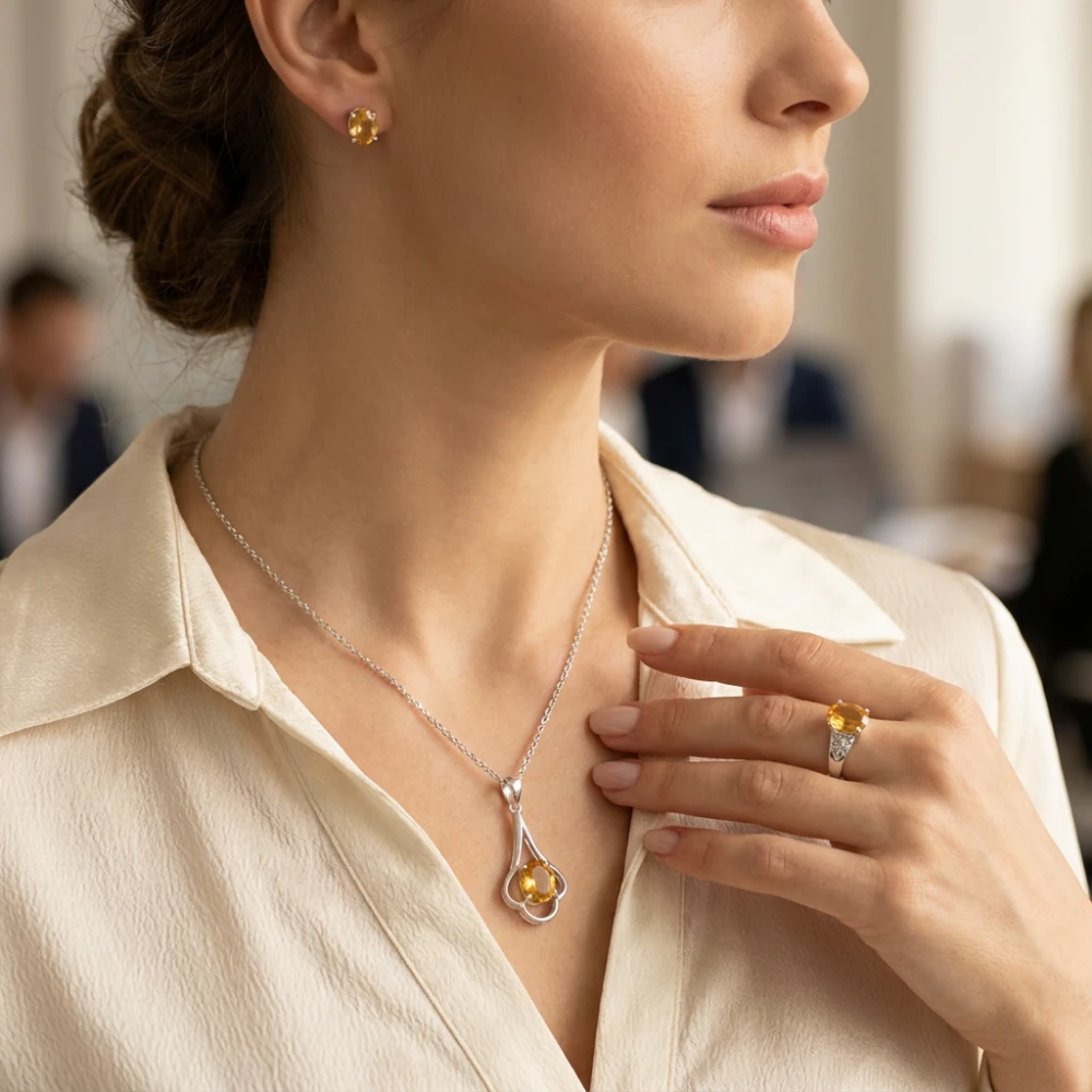 The Golden Ember Elegance Set celebrates the warm, radiant beauty of natural Citrine. Crafted in polished sterling silver, this refined three-piece set—pendant, stud earrings, and ring—offers a timeless design that transitions effortlessly from everyday elegance to evening sophistication.