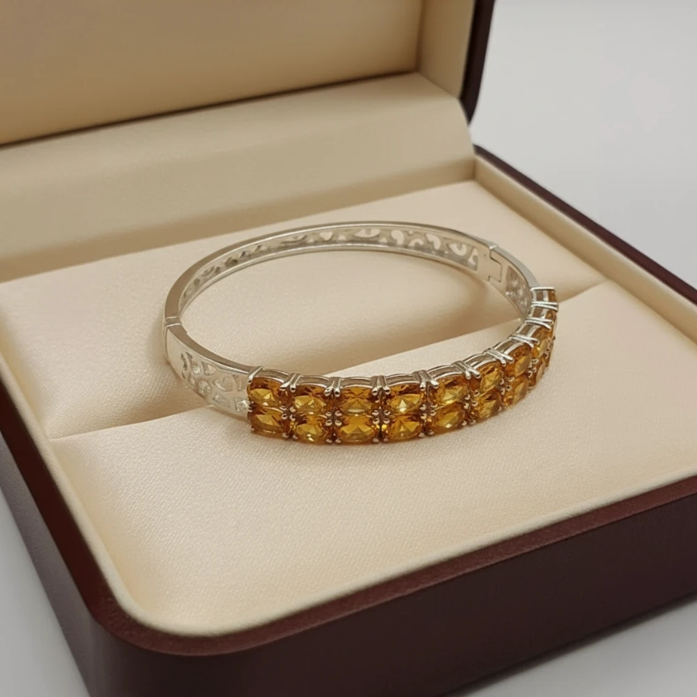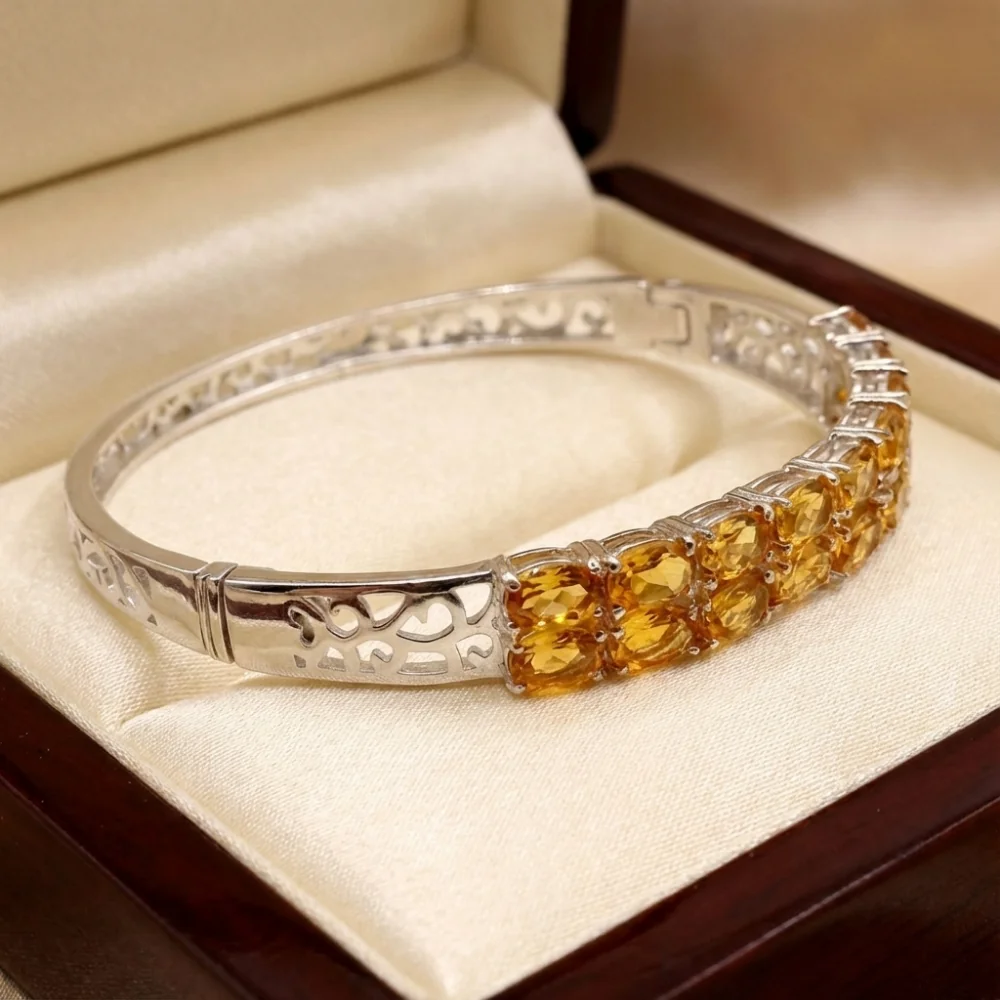 The Golden Ember Hinge Bangle features natural oval-cut citrine gemstones arranged in a refined double-row design, radiating warmth and golden brilliance. Crafted in polished 925 sterling silver, this hinged bangle blends vibrant colour with timeless elegance, offering both comfort and secure everyday wear.