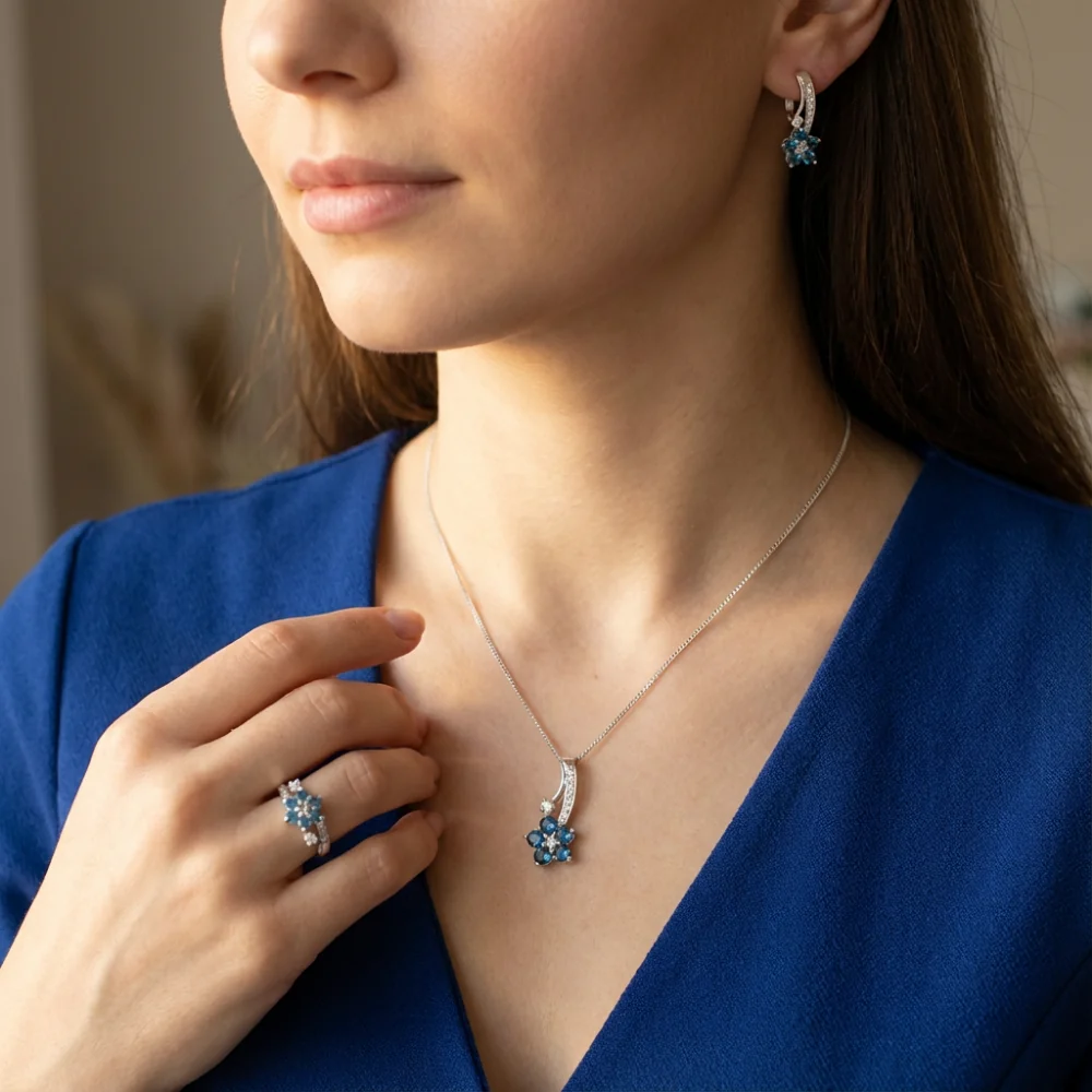 The London Bloom Cascade Set celebrates the rich depth of natural London Blue Topaz through an elegant floral-cluster design. Each piece features a delicate arrangement of round-cut gemstones, highlighted by a softly curved silver bar accented with subtle pavé detailing, creating a graceful flow and refined sparkle.