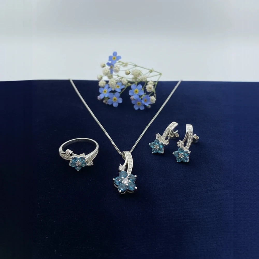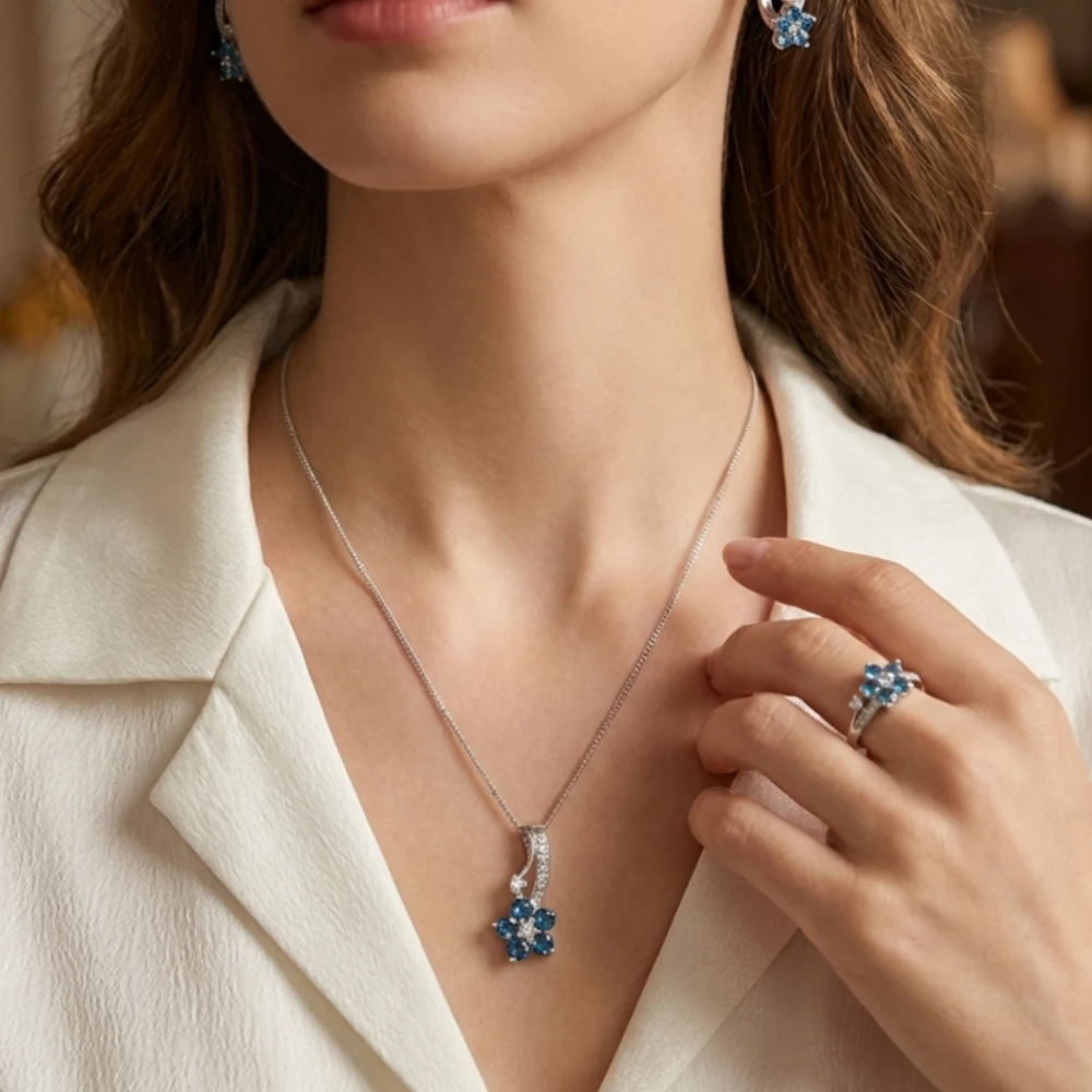 Style the full set for a refined, statement look, or wear individual pieces to add a soft floral touch and deep blue elegance to both daytime and evening ensembles.