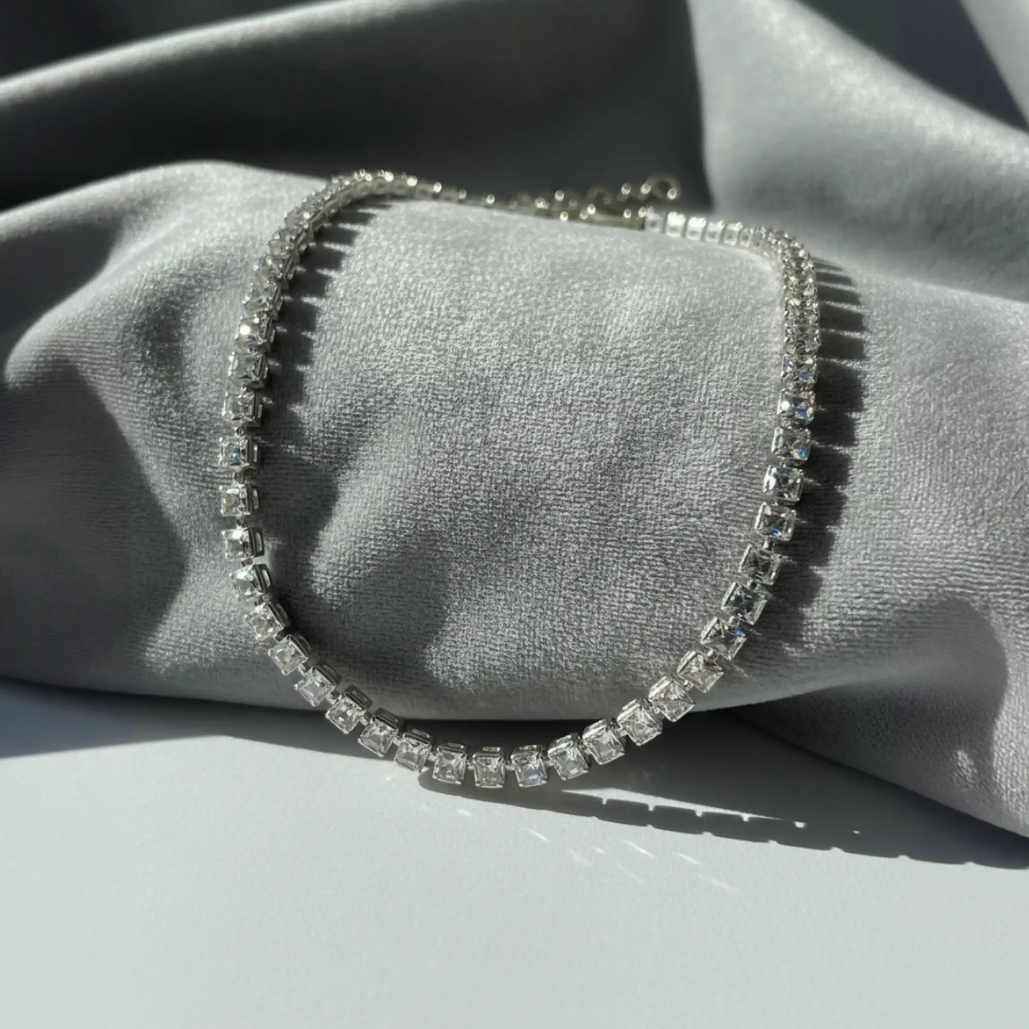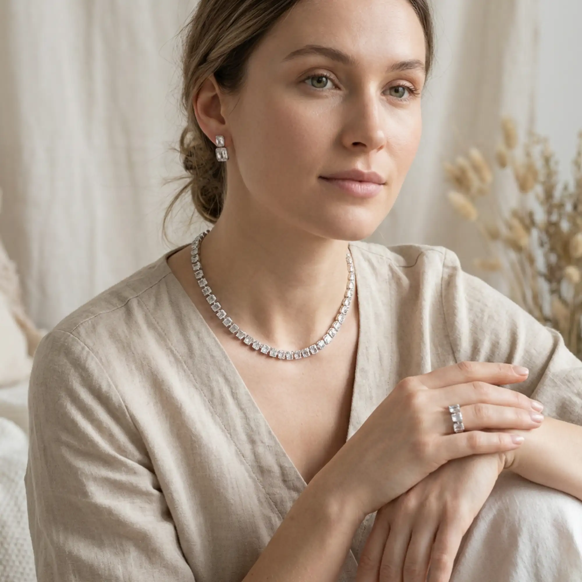 The Luminous Prism Necklace captures pure, refined brilliance in a sleek modern silhouette. A continuous line of natural princess-cut white topaz gemstones is expertly hand-set in polished 925 sterling silver, creating a crisp geometric sparkle that reflects light from every angle. Elegant yet understated, this necklace is designed to elevate both everyday looks and evening ensembles with effortless sophistication.