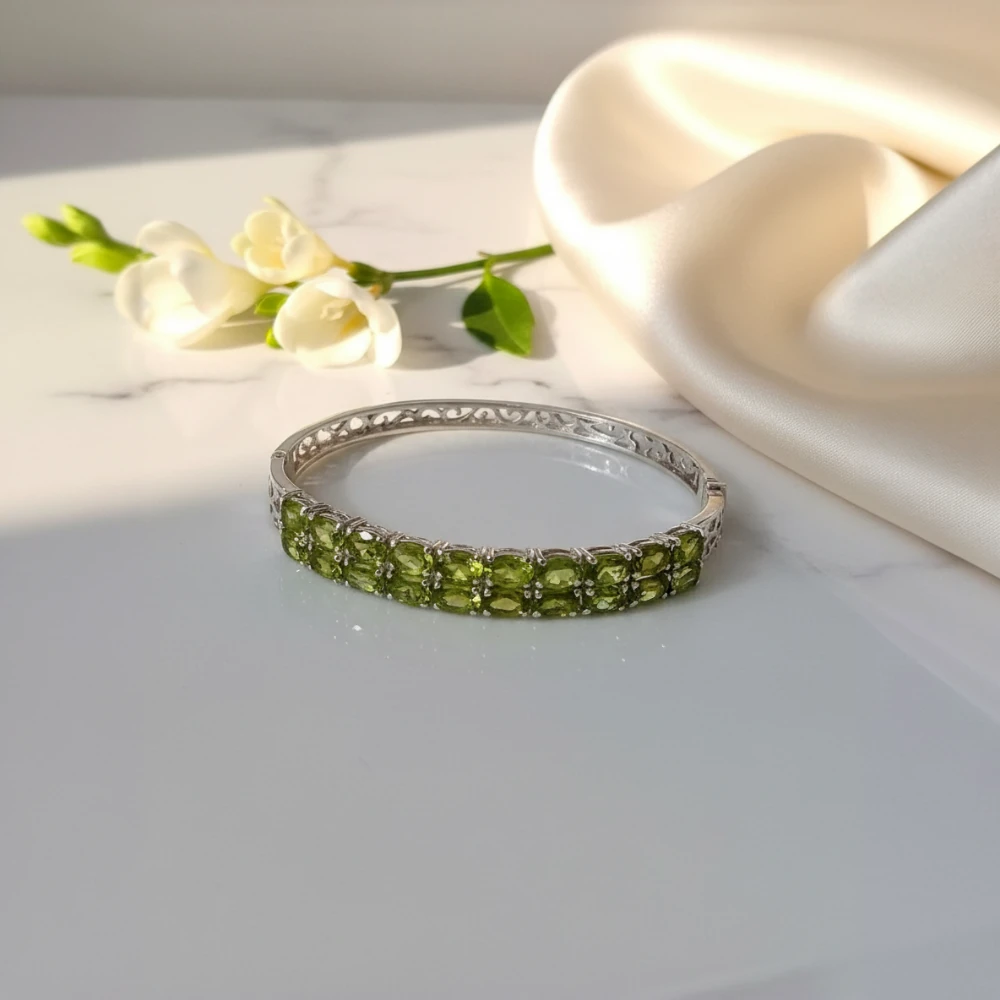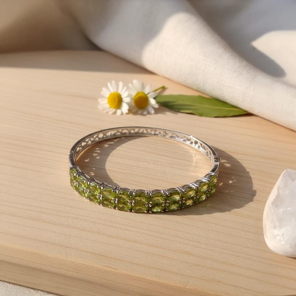 The Meadow Glow Hinge Bangle features natural oval-cut peridot gemstones arranged in a refined double-row design, offering vibrant freshness and luminous green brilliance. Crafted in polished 925 sterling silver, this hinged bangle combines comfort, security, and timeless elegance with a refreshing pop of colour.