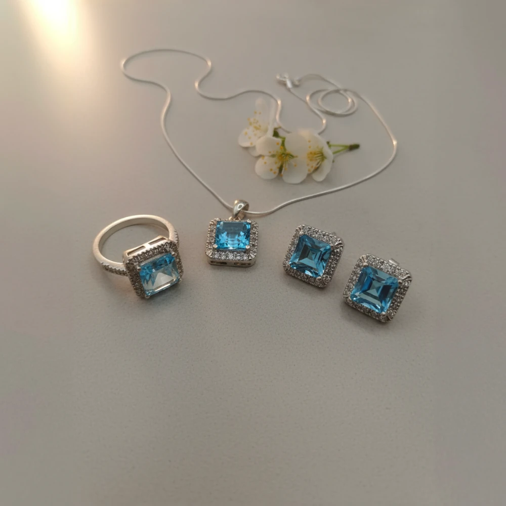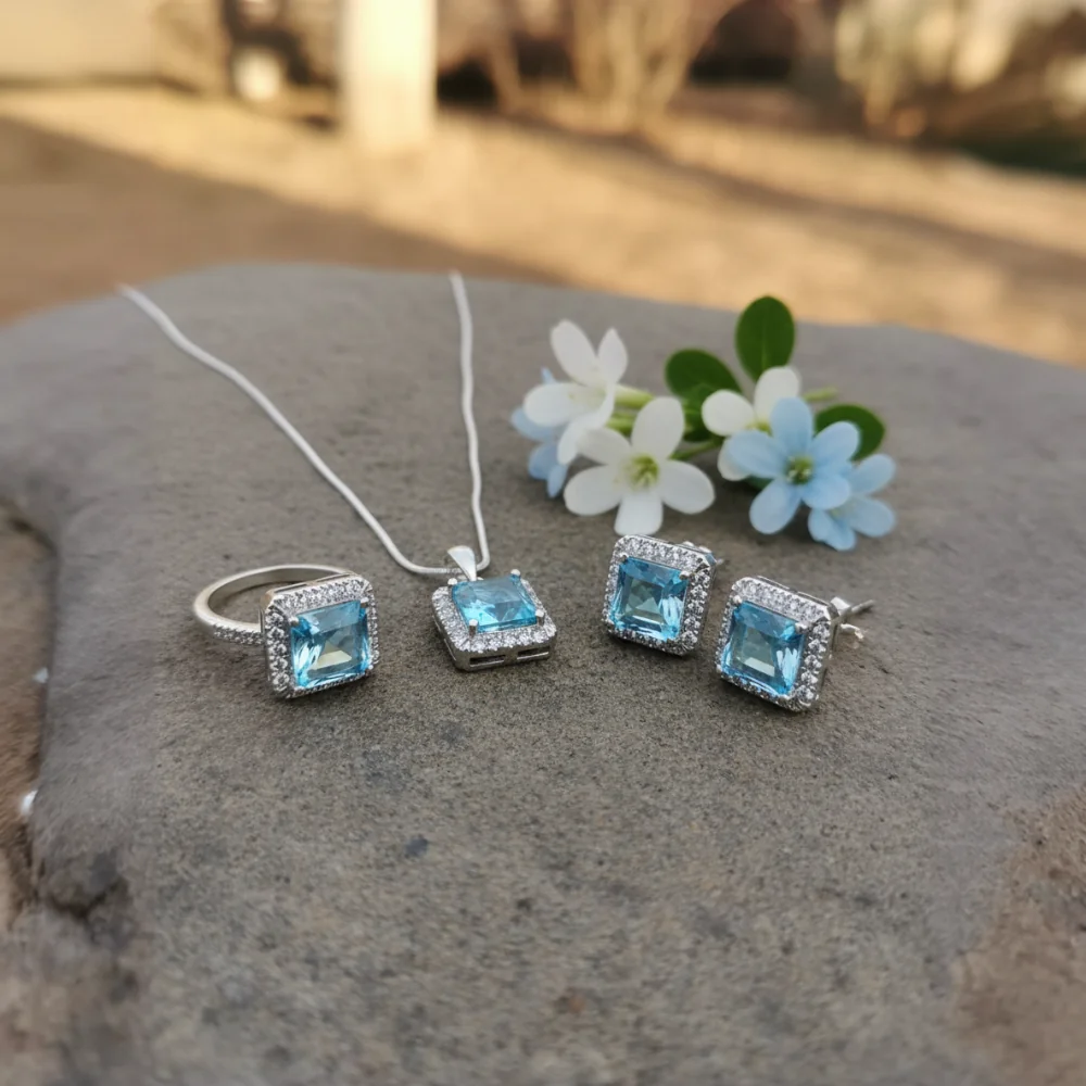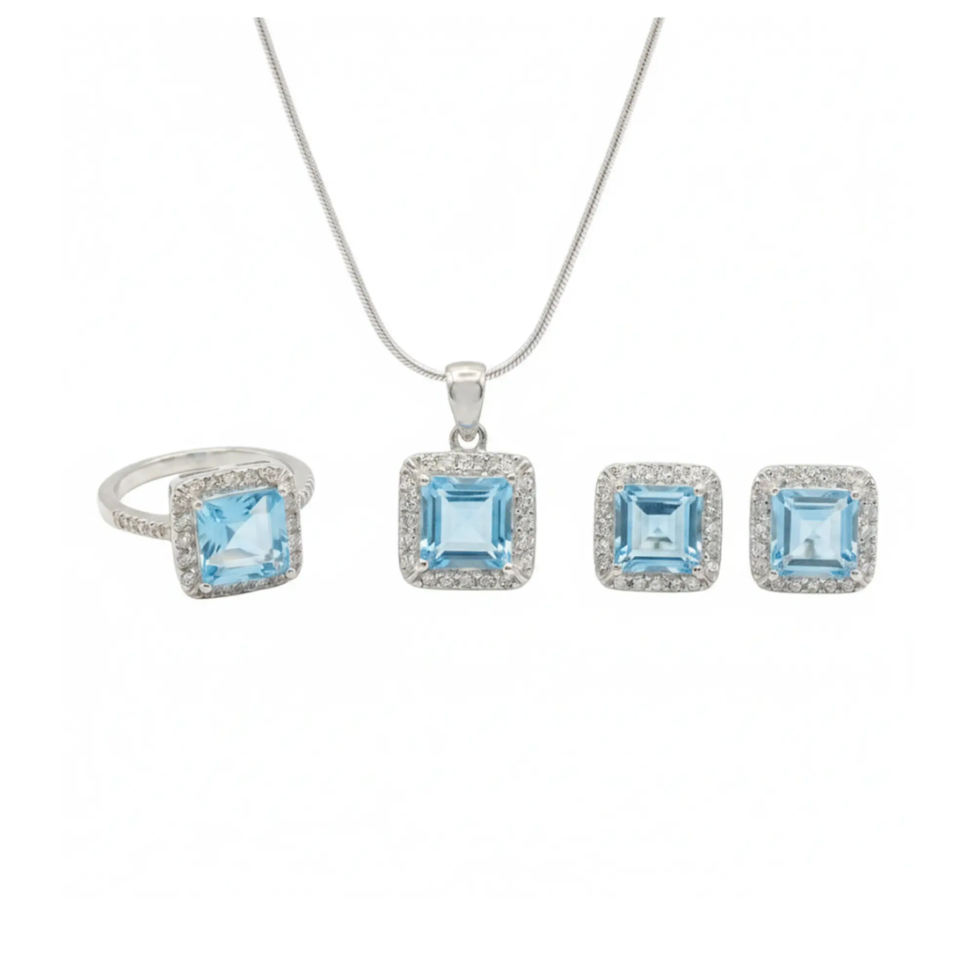 The Ocean Prism Halo Set reflects the serene beauty of crystal-blue waters, showcased through precision-cut natural Blue Topaz gemstones. Each piece—pendant, stud earrings, and ring—features a striking square-cut centre stone framed by a luminous halo of White Topaz, creating exceptional brilliance and symmetry.