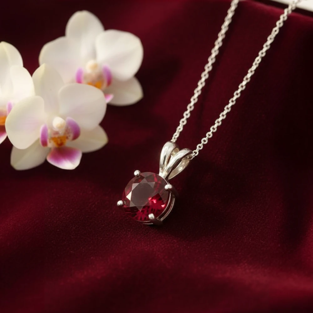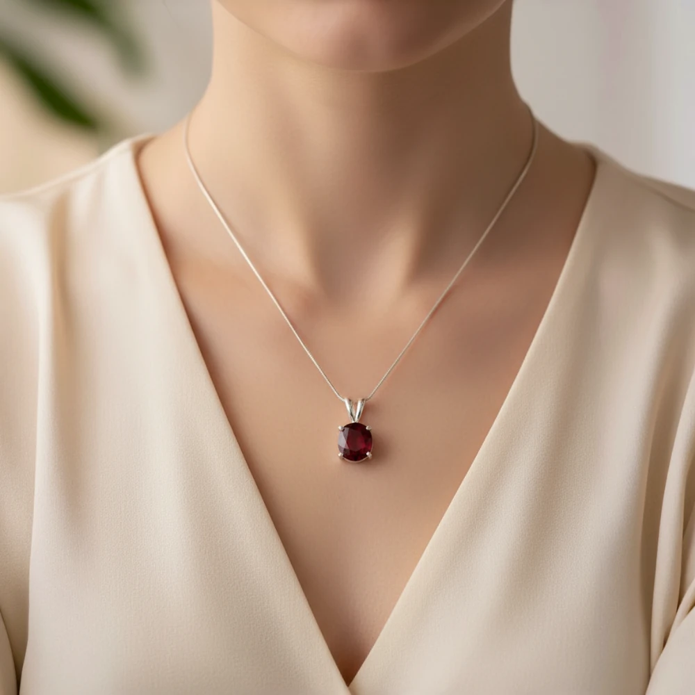 Wear it on a fine chain to let the garnet’s deep red glow stand out—perfect with black, white, or rich jewel-toned outfits.