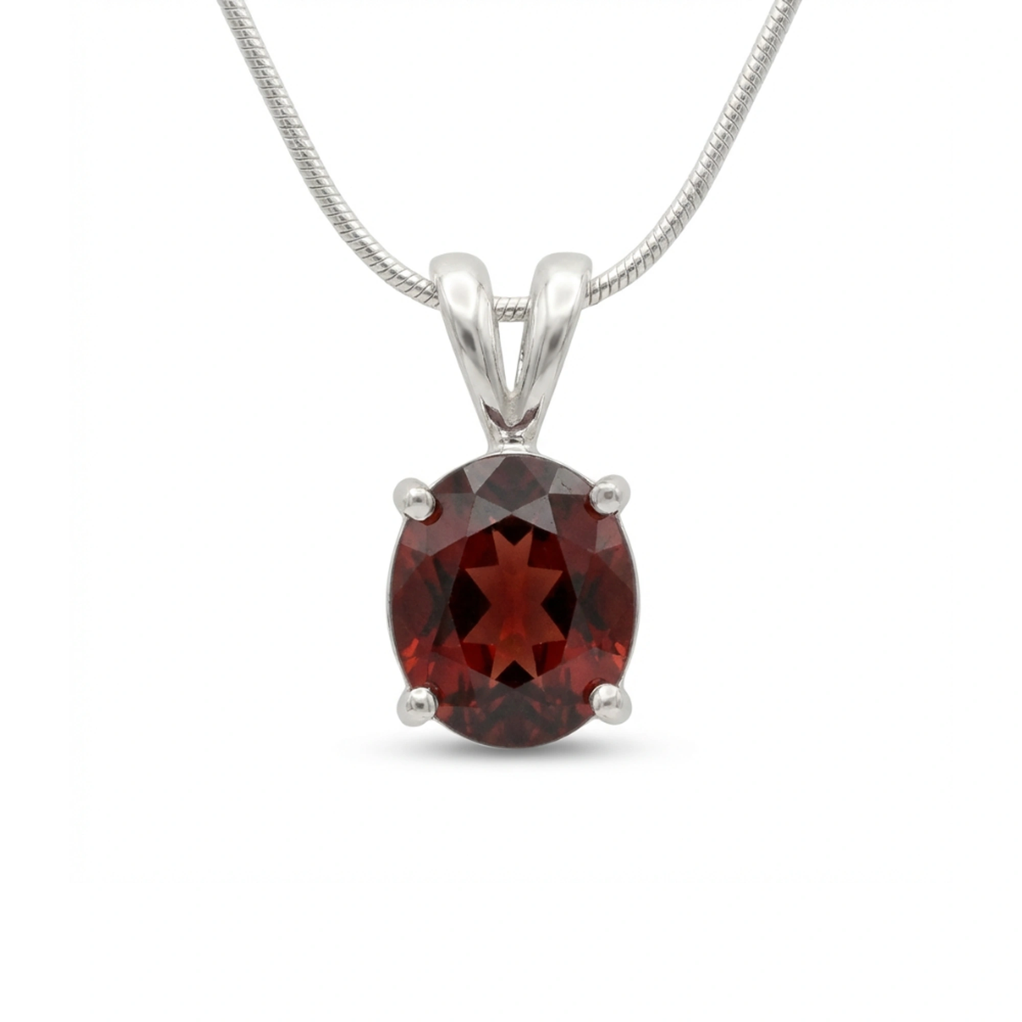 Crafted in polished 925 sterling silver, the classic four-prong setting allows light to enhance the garnet’s natural brilliance while keeping the design clean and sophisticated. Elegant yet versatile, this pendant transitions effortlessly from everyday wear to evening refinement.
