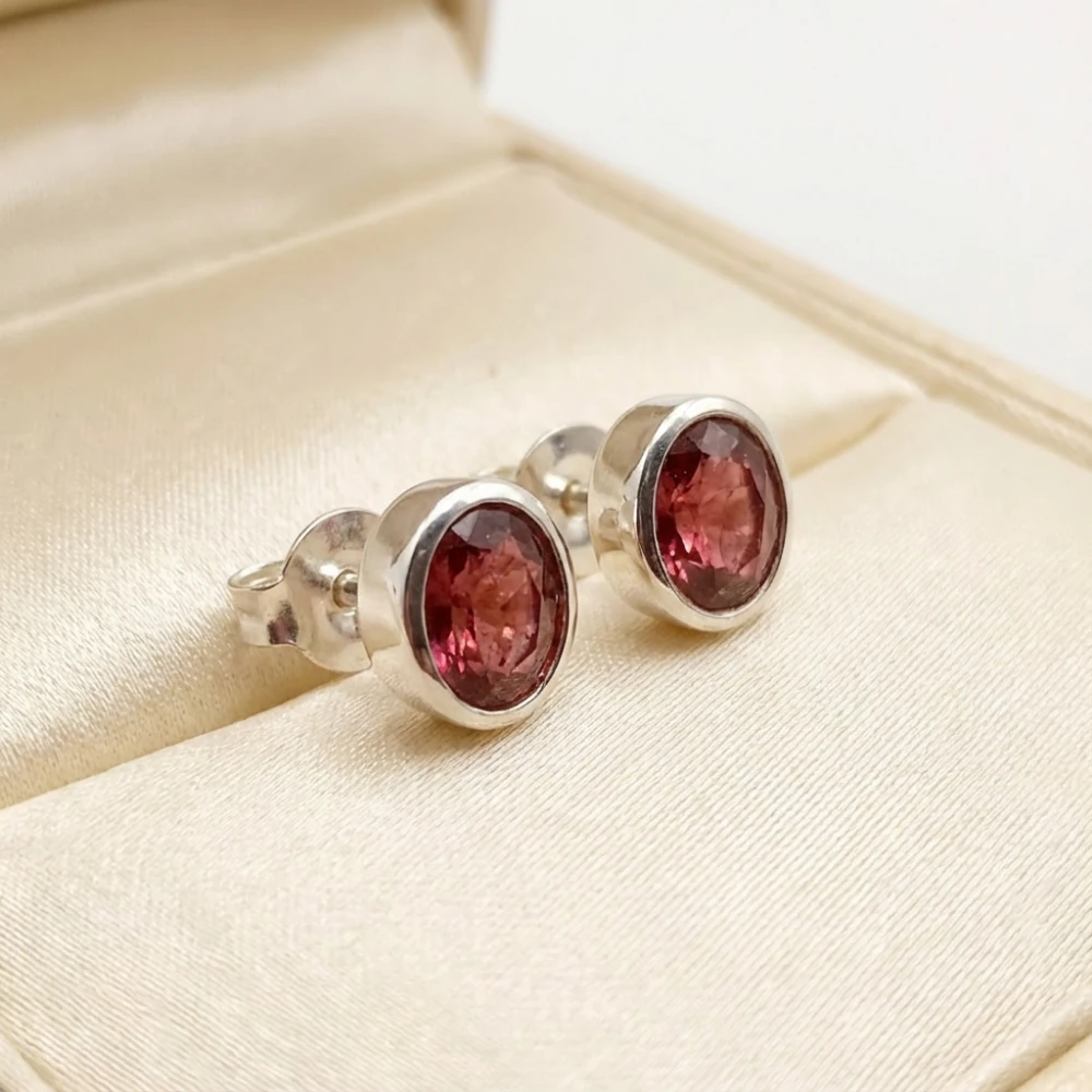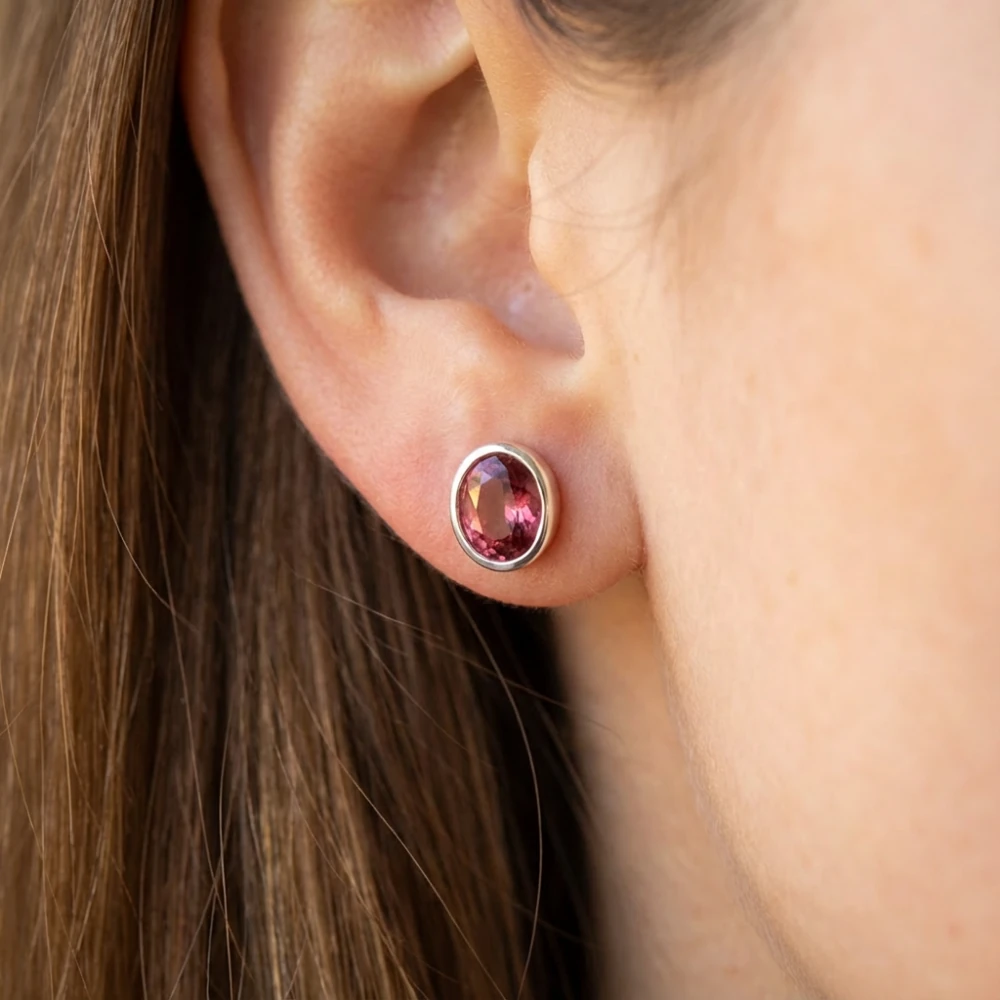 The Rose Gleam Rhodolite Bezel Studs bring a soft yet striking elegance through their natural rhodolite garnets, known for their refined rosy-purplish red tones. Each gemstone displays a beautiful inner glow, enhanced by precision faceting that reflects light with every movement.