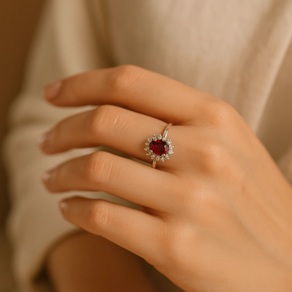 Pair with blush, burgundy, or neutral outfits to highlight the garnet’s romantic rose-red hue.