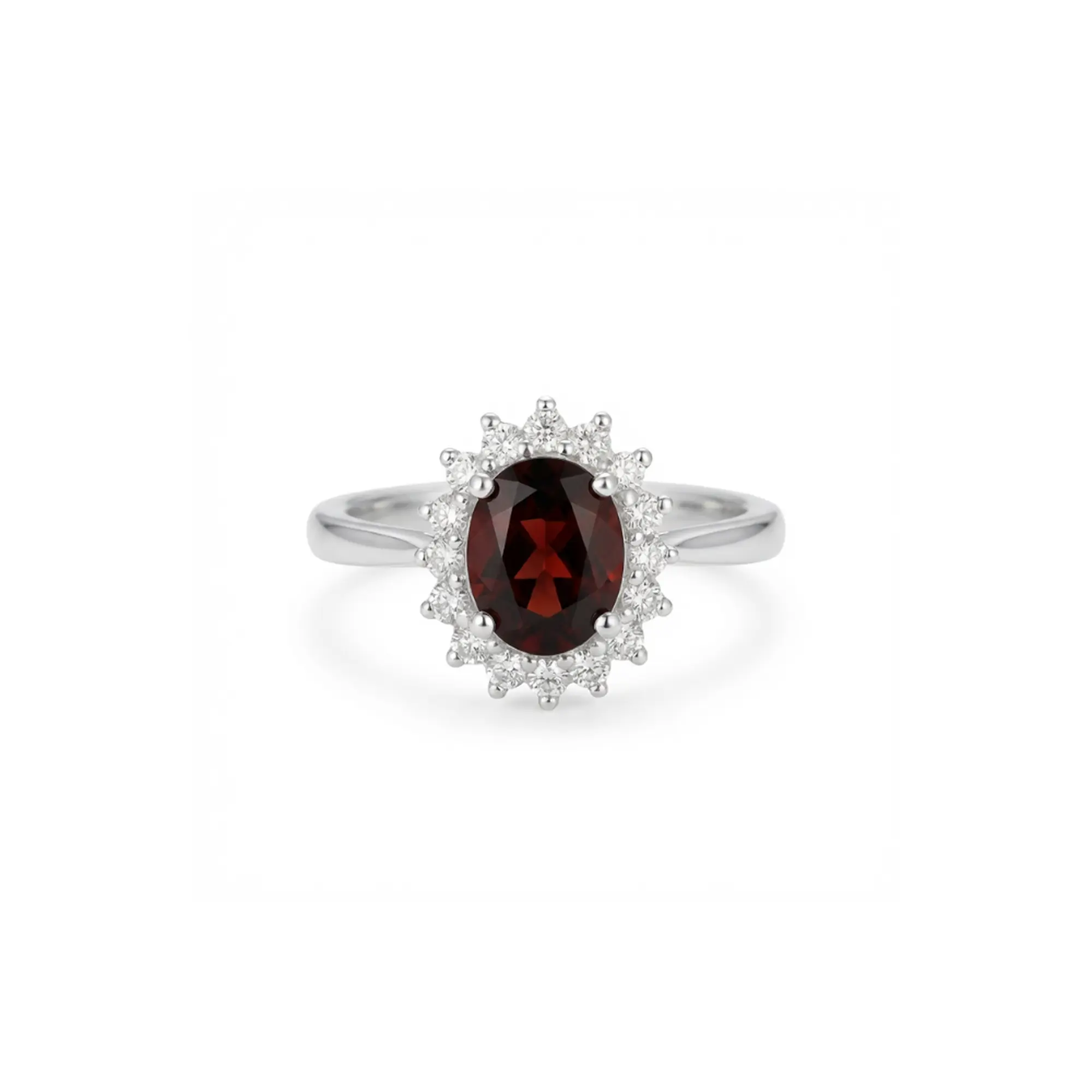 The Royal Radiance Petite Ring – Rhodolite Garnet showcases romantic sophistication through its rose-red oval-cut rhodolite garnet centre. Encircled by a halo of sparkling white topaz, the design offers a refined balance of warmth, brilliance, and feminine elegance.