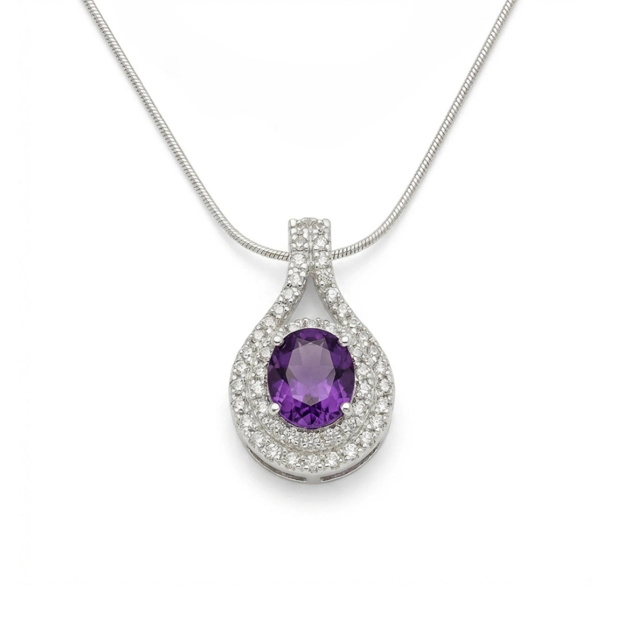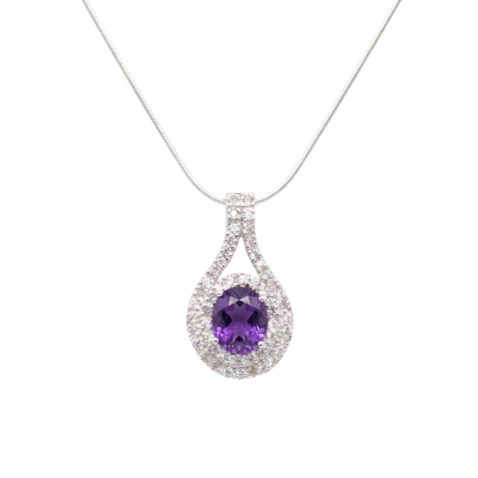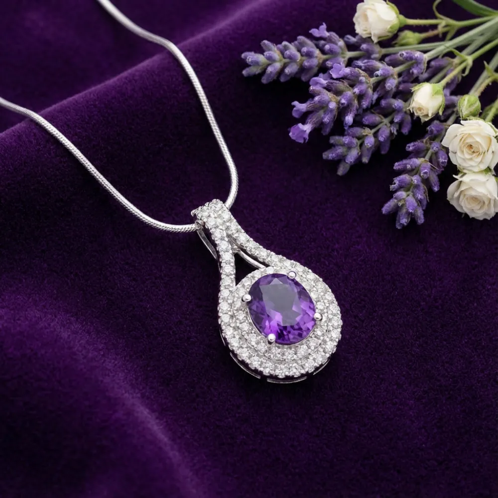 The Violet Aura Pendant – Amethyst embodies elegance, depth, and timeless charm. At its centre, a richly hued oval-cut natural amethyst radiates calming purple brilliance, symbolising wisdom, balance, and inner strength. Encircled by a refined double halo of sparkling white topaz, the pendant reflects light with graceful intensity.