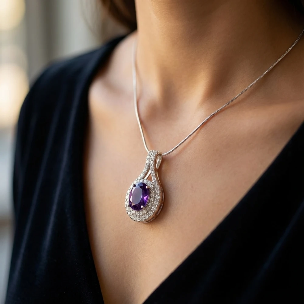 Style the Violet Aura Pendant with silver, black, or soft pastel outfits to enhance its regal purple glow. Pair it with amethyst studs for a graceful, coordinated look ideal for evenings and special occasions.